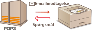 Med funktionen Udskrivning Af E-mail kan du udskrive meddelelser og vedhæftede JPEG- eller TIFF-billedfiler, der modtages fra en POP3-mailserver, uden at skulle bruge en computer. Man kan modtage e-mails manuelt eller automatisk ved regelmæssige intervaller. Hvis der anvendes SMTP-protokol, udskrives e-mails, der er sendt direkte til maskinen uden mailserver.