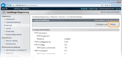 Angiv intervallet i minutter for automatisk oprettelse af forbindelse til mailserveren. Nye e-mails i mailserverens indbakke modtages automatisk og udskrives med de angivne tidsintervaller. Du kan også angive denne indstilling ved at bruge <POP3-modtag.interval> i indstillingsmenuen i kontrolpanelet (