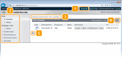 Viser siden [Statusmonitor/Annullér]. Du kan bruge denne side til at kontrollere den aktuelle udskrivningsstatus, annullere udskrivningsprocessen og se historikken over udskrivningsjob.