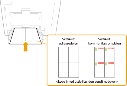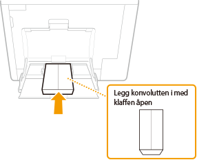 Legg i konvolutter i stående retning (med den korte kanten mot maskinen) med forsiden (siden uten limkant) vendt ned. Du kan ikke skrive ut på baksiden av konvolutter.