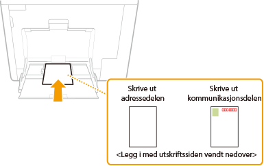Denne delen beskriver hvordan du legger inn konvolutter i retningen du ønsker, samt prosedyrene som du må utføre før du legger inn konvolutter eller postkort. For en beskrivelse av den generelle fremgangsmåten for å legge konvolutter eller postkort i flerfunksjonsskuffen, kan du se Legge papir i flerfunksjonsskuffen.