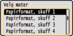 <Papirformat, skuff 2> til <Papirformat, skuff 4> vises når den valgfrie papirmateren er installert.