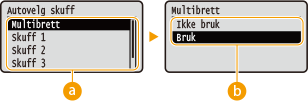 Når <MP-skuff for bl.frm.> er satt til <På>, mates papiret fortrinnsvis fra papriskuffen selv om <MB-skuffprioritet> er satt til <På>.