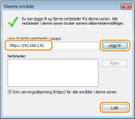 Sjekk at "https://<IP-adressen til maskinen> eller <vertsnavnet for maskinen>.<domenenavnet>/" vises og klikk på [Legg til]