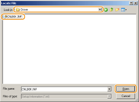 Angi mappen som inneholder skriverdriverne, velg INF-filen og klikk deretter på [Åpne].