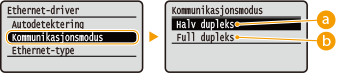 Velg <Halv dupleks> eller <Full dupleks> ![]() ![]() <Halv dupleks>Sender og mottar kommunikasjonsdata etter tur. Velg når maskinen er koblet til en nettverksenhet som bruker halv dupleks.