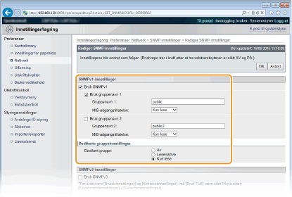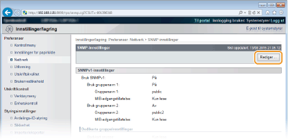 Hvis begge versjoner av SNMP er aktivert, anbefales det at MIB-tilgangstillatelsen i SNMPv1 angis til [Kun lese]. MIB-tilgangstillatelsen kan angis uavhengig i SNMPv1 og SNMPv3 (og for hver bruker i SNMPv3). Ved å velge [Lese/skrive] (full tilgangstillatelse) i SNMPv1 oppheves de robuste sikkerhetsfunksjonene som er et kjennetegn i SNMPv3, fordi de fleste av maskininnstillingene dermed kan kontrolleres med SNMPv1.