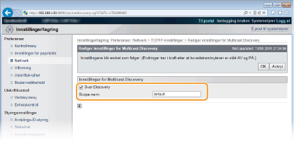 Merk av i boksen for at maskinen skal reagere på multikastoppdagingspakker for enhetsstyringsprogramvare, og aktiver overvåkning av enhetsstyringsprogramvare. Hvis du ikke ønsker at maskinen skal reagere, fjerner du merket i avkrysningsboksen. [Scope-navn]