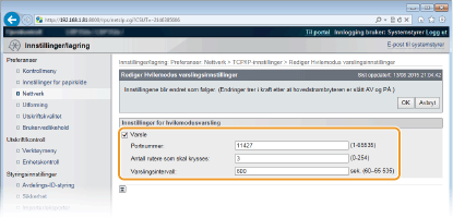 Endre portnummeret for denne funksjonen i henhold til nettverksmiljøet. [Antall rutere som skal krysses]