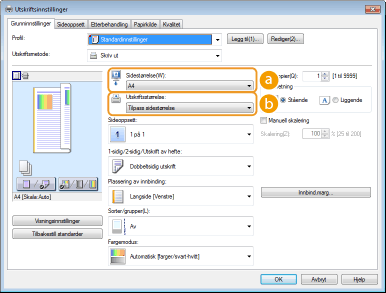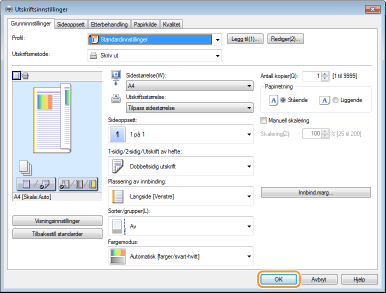 Det er enkelt å angi sideoppsett, innbindingsposisjon osv. intuitivt i forhåndsvisningsbildet. For mer informasjon, klikk på [Hjelp] på skjermbildet for skriverdriveren.