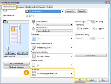 Du kan velge en fargemodus (farger eller svart/hvitt). Hvis et dokument har sider i både farge og svart/hvitt, ved å spesifisere automodus, skrives sider ut i farge, og svart/hvitt-sider skrives automatisk ut i svart/hvitt.