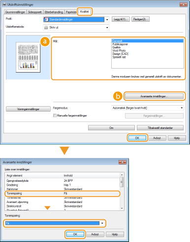 I skjermbildet [Avanserte innstillinger] kan du spesifisere forskjellige andre utskriftsinnstillinger enn tonerspareinnstillinger. For mer informasjon, klikk på [Hjelp] på skjermbildet for skriverdriveren.