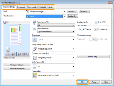 Klikk på kategoriene [Grunninnstillinger], [Sideoppsett], [Etterbehandling], [Papirkilde] eller [Kvalitet] for å angi utskriftsinnstillingene på hver skjerm ved behov.