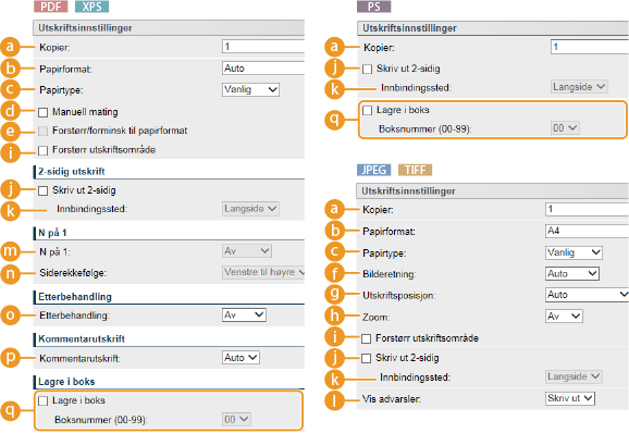 Når du angir utskriftsinnstillingene for XPS-filerFjern merket i [Prioriter utskriftsbillett]-avkrysningsboksen. Hvis boksen er valgt, er noen av elementene utilgjengelige.