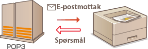 Når e-postmottak starter, skrives alle e-poster i innboksen til e-postserveren ut. Hvis du sender e-poster som du ønsker å skrive ut på maskinen på forhånd, kan du skrive ut e-postene automatisk ved regelmessige tidsintervaller eller skrive ut alle lagrede e-poster ved vilkårlige tider.