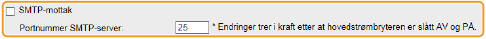 Velg avkrysningsboksen for å aktivere e-postutskrift ved å bruke SMTP-protokollen. DU kan også angi denne innstillingen ved å bruke <SMTP-mottak> i betjeningspanelets innstillinger-meny (