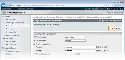 Dette avsnittet beskriver hvordan du angir innstillingene for mottak og utskrift av e-poster på denne maskinen. Bruk en datamaskin for å angi innstillingene for mottak av e-poster og maskinens betjeningspanel for å angi innstillingene for utskrift av e-poster.