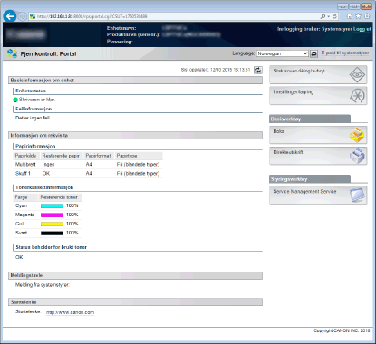 For ekstern betjening må du angi IP-adressen til maskinen i en nettleser og starte Fjernkontroll. Kontroller IP-adressen som er angitt på maskinen, på forhånd (