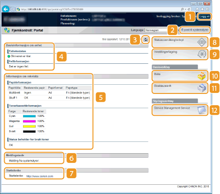 Viser gjeldende status for maskinen og feilinformasjon. Hvis det har oppstått en feil, vises en kobling til en side med feilinformasjon.