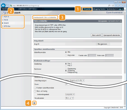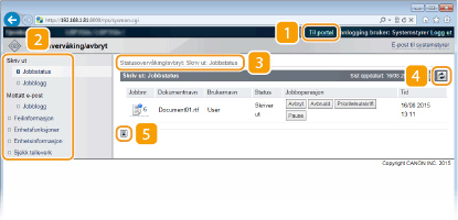 Viser [Statusovervåking/avbryt]-siden. Du kan bruke denne siden til å kontrollere gjeldende utskriftsstatus, avbryte utskriftsprosessen og vise en historikk over utskriftsjobber.