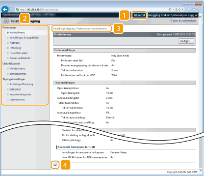 Viser siden [Innstillinger/lagring]. Når du er logget på i administrasjonsmodus, kan du endre innstillingsalternativene og lagre / laste inn registrerte data.