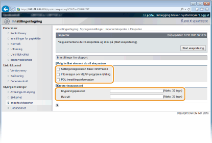 Du kan eksportere maskininnstillingsdata og lagre dem på en datamaskin. Det anbefales at du regelmessig sikkerhetskopierer viktige innstillinger.