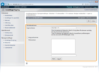 Angi en IP-adresse (eller utvalget av IP-adresser) i [Lagre adresse].