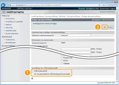 Fjern merket i avkrysningsboksen for å deaktivere direkte utskrift fra en USB-minneenhet. Velg avkrysningsboksen for å aktivere utskrift fra en USB-minneenhet. Hvis du også velger [Vis skjermbilde for USB-direkteutskrift automatisk]-avkrysningsboksen, vises USB direkte utskrift-skjermen automatisk når en USB-minneenhet er koblet til maskinen.