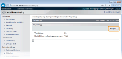 Hvis du velger avmerkingsboksen, kan programvare for enhetsbehandling, som imageWARE Enterprise Management Console, brukes til å hente inn en historikk over utskriftsjobber. Fjern merket for å deaktivere administrasjonsprogramvaren for innhenting av historikken over utskriftsjobber. Denne funksjonen aktiveres automatisk når avmerkingsboksen [Vis jobblogg] er valgt.