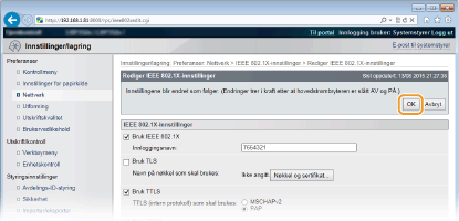 Bruke betjeningspaneletDu kan også aktivere eller deaktivere IEEE 802.1X-autentisering via innstillinger-menyen på betjeningspanelet. IEEE802.1X