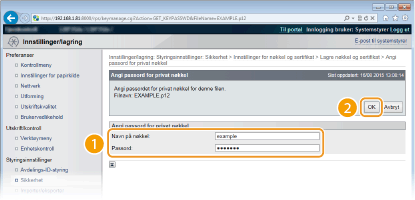 Nøkkelpar og digitale sertifikater kan skaffes fra en sertifiseringsinstans (CA) for å brukes med maskinen. Du kan lagre og deretter registrere disse filene ved hjelp av Fjernkontroll. Sørg for at nøkkelparet og sertifikatet oppfyller kravene til maskinen (