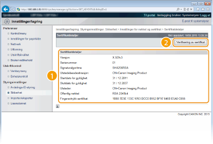 Kontroller detaljene i sertifikatet og klikk på [Verifisering av sertifikat].