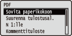 Kaikki PDF-tiedostojen USB-suoratulostuksen ja suoratulostuksen asetukset ja lyhyet kuvaukset luetellaan. Oletusasetukset on merkitty tikarilla (