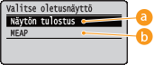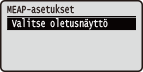 Päänäytön MEAP-asetuskohteet ja lyhyet kuvaukset luetellaan. Oletusasetukset on merkitty tikarilla (