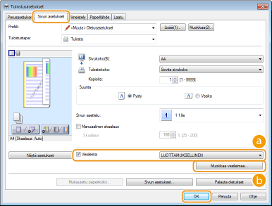 Valitse kukin välilehti ja määritä vesileiman teksti, väri ja tulostuskohta. Lisätietoja saat valitsemalla tulostinajurinäytön kohdan [Ohje].