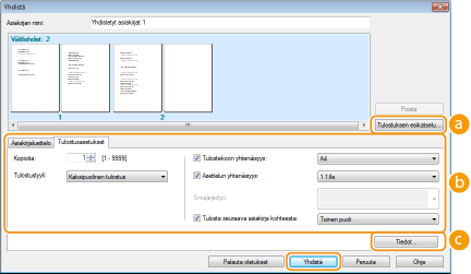 Canon PageComposer -ohjelmalla voit yhdistää useita asiakirjoja yhdeksi tulostustyöksi ja tulostaa työn määritetyillä tulostusasetuksilla. Tämän toiminnon avulla voit esimerkiksi yhdistää eri sovelluksilla luotuja asiakirjoja ja tulostaa kaikki sivut samankokoiselle paperille.