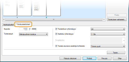 [Tulostusasetukset] -välilehti avaa näytön, jossa määritetään tulostusasetukset, kuten kopioiden määrä ja 1-puolinen/2-puolinen tulostus. Tässä määritettyjä asetuksia käytetään koko tulostustyöhön.