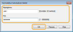Syötä [Asiakirjan nimi], [Käyttäjänimi] ja [PIN] ja napsauta [OK].