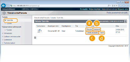 Tehtaan oletusasetukset estävät eräiden toimenpiteiden, kuten tulostettavan asiakirjan poistamisen tai tulostustyön keskeyttämisen, suorittamisen yleisessä käyttäjätilassa. Jos haluat käyttää asiakirjoja yleisessä käyttäjätilassa, kirjaudu hallintatilaan ja ota [Salli tavallisen käyttäjän työtoiminto] käyttöön. Asiakirjojen käytön salliminen loppukäyttäjille