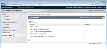 Valitse pysäytetyn asiakirjan tai turvatulostusasiakirjan [Työnumero], jos haluat nähdä tarkat tiedot. Voit tarkistaa tulostetun asiakirjan käyttäjänimen ja sivumäärän.