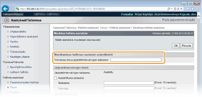 Syötä järjestelmänvalvojan salasana kohtaan [Voimassa oleva järjestelmänvalvojan salasana].