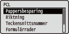 Alla inställningar för PCL-kontrollkommandon visas med korta beskrivningar. Standardinställningarna är markerade med ett kors (