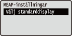 Inställningsalternativen för huvudskärmen på MEAP visas med korta beskrivningar. Standardinställningarna är markerade med ett kors (