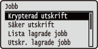 ( ) på kontrollpanelen visas menyn Jobb. Du kan ange inställningarna som beskrivs nedan när enheten är offline. |