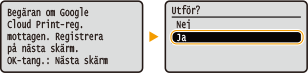 Du kan även registrera enheten från en mobil enhet eller Google Chrome. Följande bekräftelseskärm visas på enheten innan registreringen slutförs. Utför  <Ja>  för att avsluta registreringen.