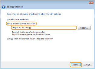 Välj [Välj en delad skrivare efter namn], ange anslutningsdestination och klicka på [Nästa].