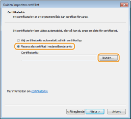 Välj [Placera alla certifikat i nedanstående arkiv] och klicka sedan på [Bläddra].