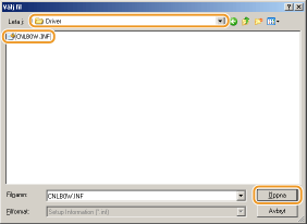 Ange mappen där skrivardrivrutinerna finns och välj INF-filen. Klicka sedan på [Öppna].