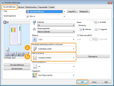Skriver ut ett dokument så att de utskrivna sidorna öppnas åt vänster efter bindningen.