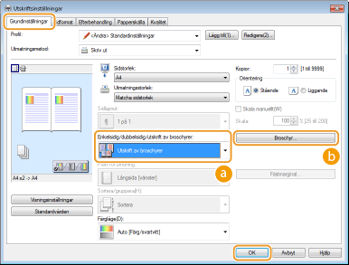 Välj [Utskrift av broschyrer] i [Enkelsidig/dubbelsidig/utskrift av broschyrer]